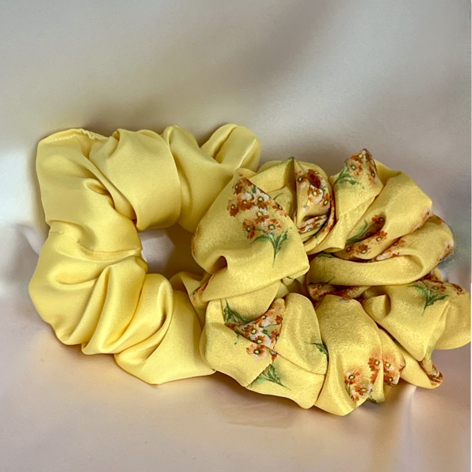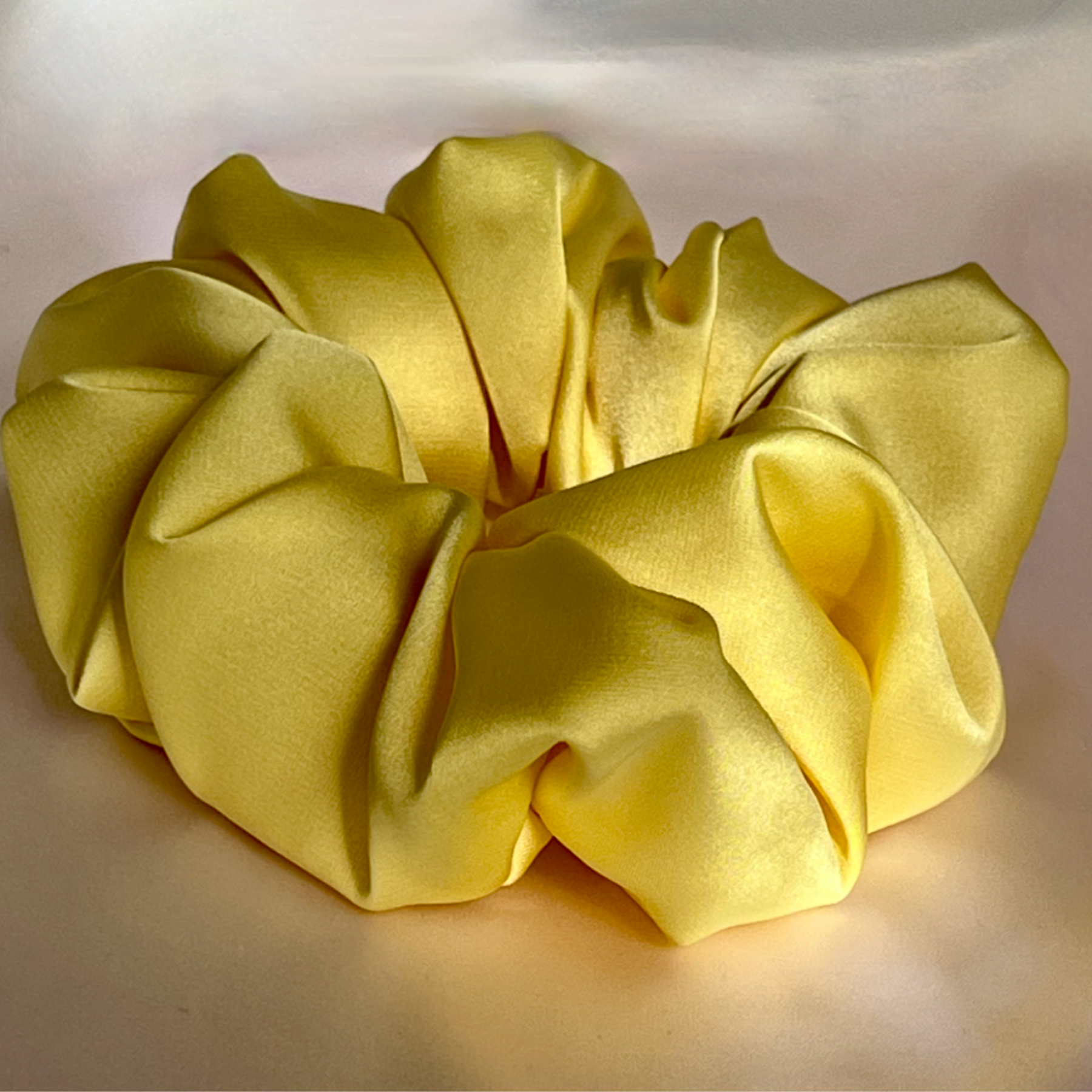 Scrunchie made with soft saffron satin, in a delicate yellow hue.