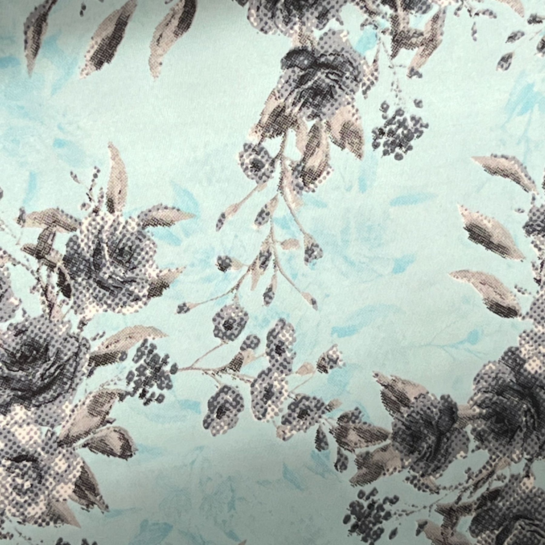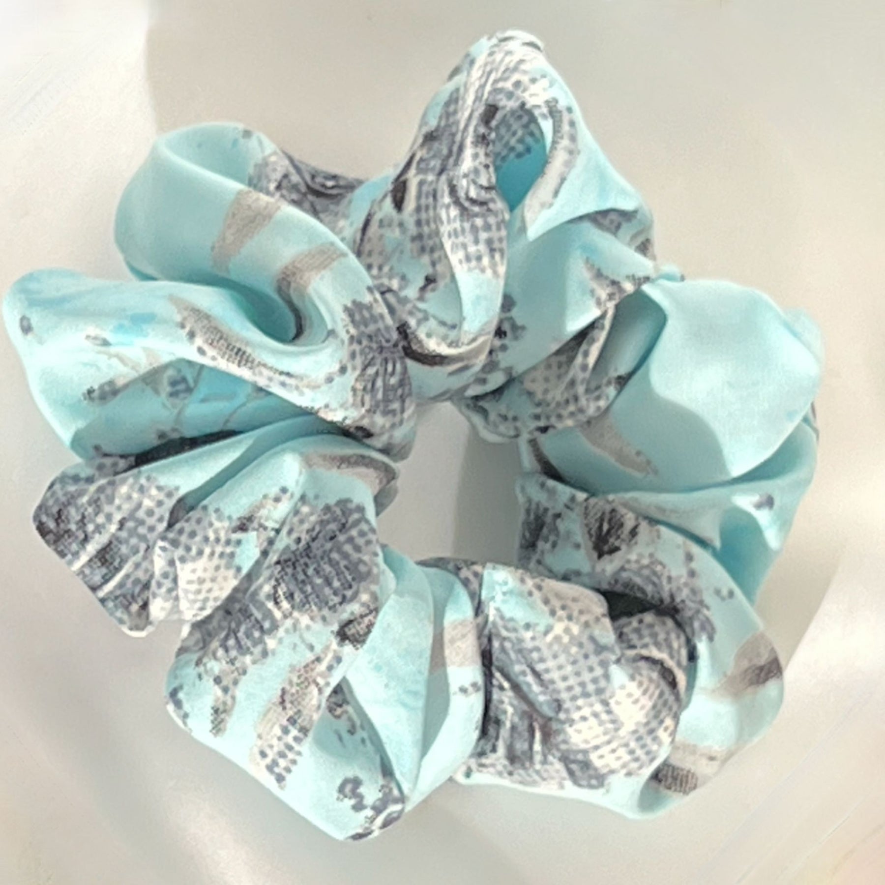 A personal favourite, this crepe scrunchie is charming - grey roses on a Capri blue background, XL size especially luxurious. Made from polyester crepe.