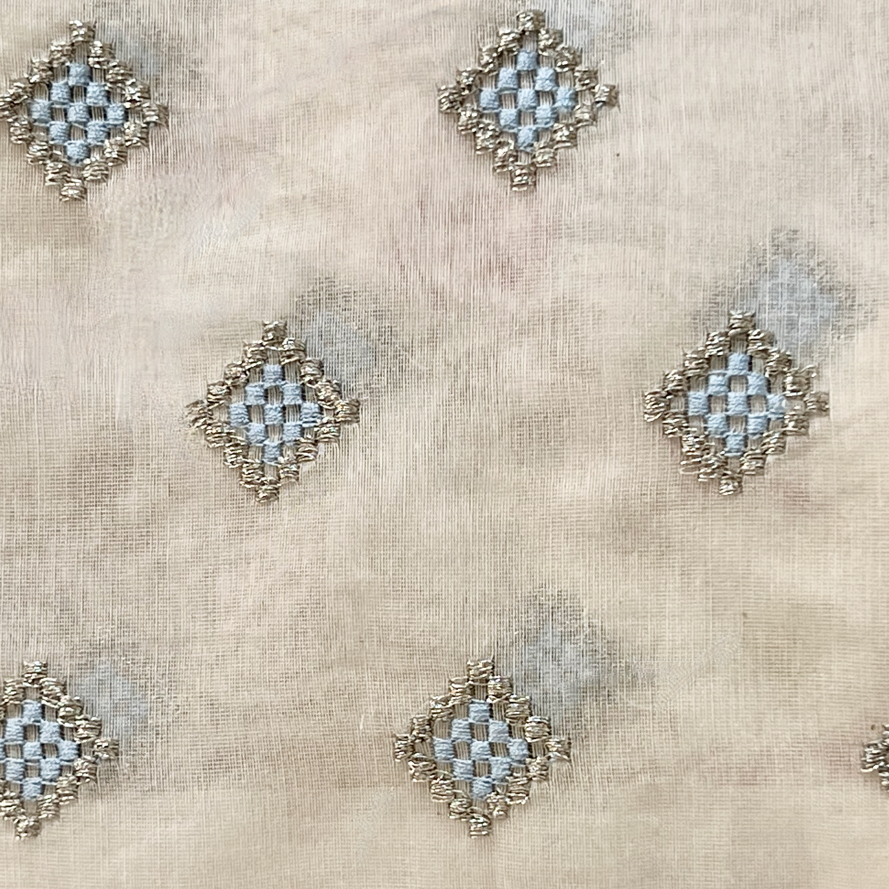This ivory fabric is made of silk but feels like lightweight linen. Embellished with pastel blue embroidered diamonds. Beautiful and delicate.